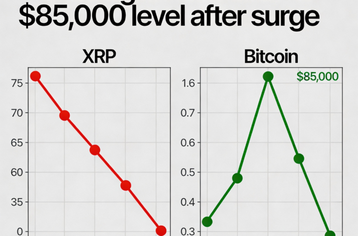 XRP falls alongside Bitcoin, which drops back to $85,000 after a surge.