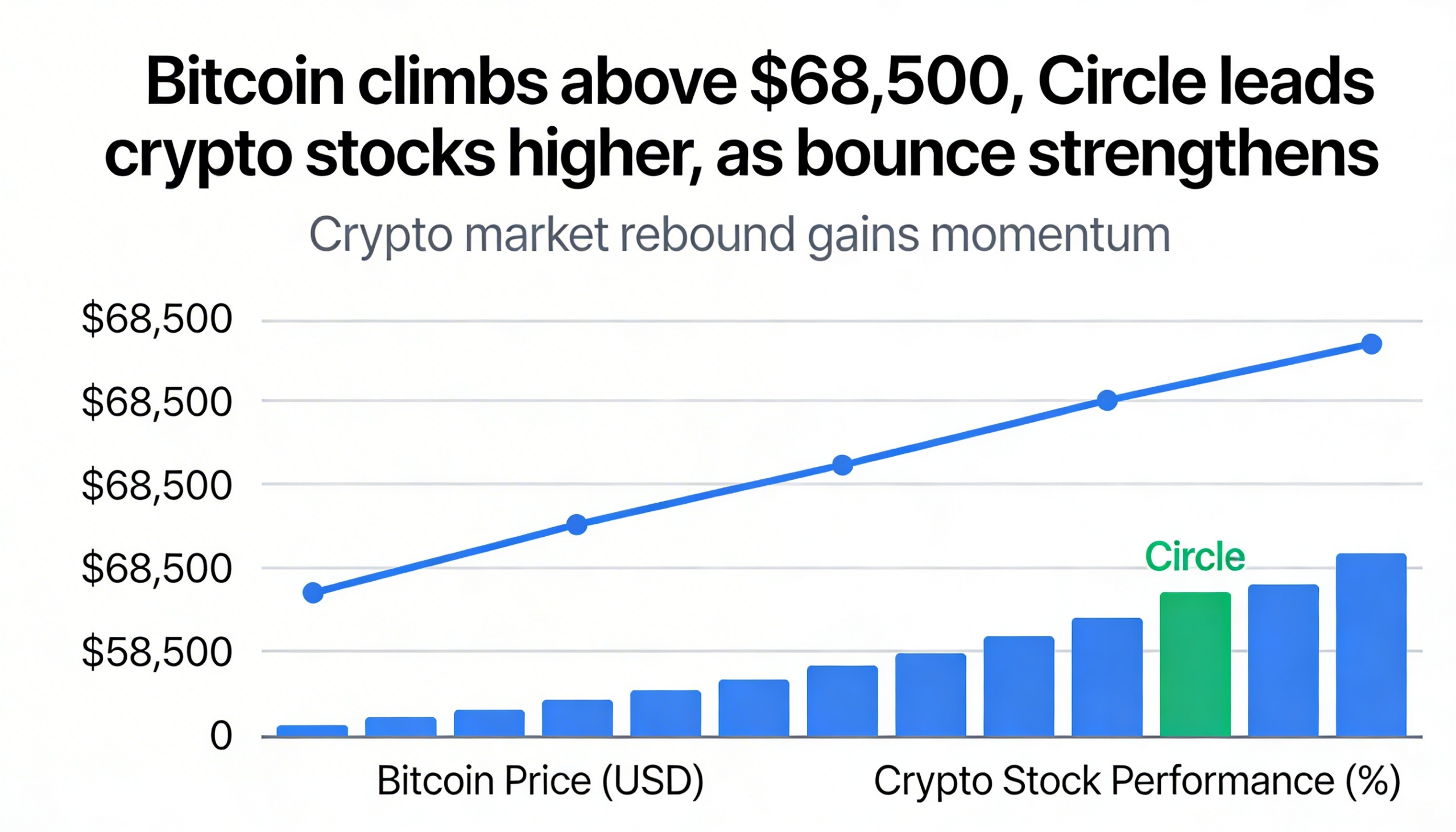 A firmer bounce lifts Bitcoin above $68,500, with Circle driving upside momentum across crypto stocks