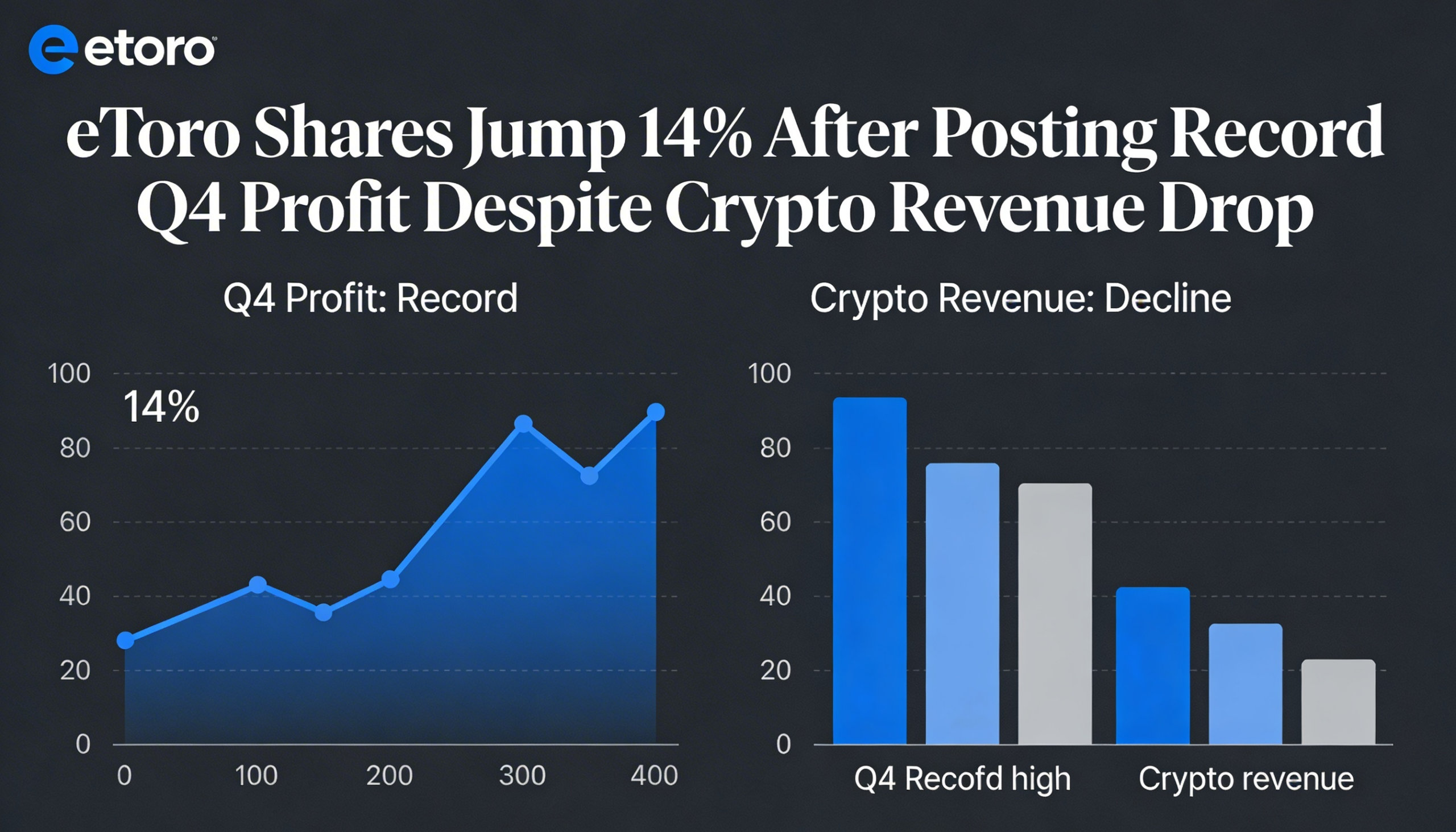 Shares of trading platform eToro surged 14% after the company reported a record fourth-quarter profit, even as crypto revenue declined