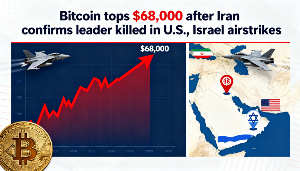 Bitcoin climbed to $68,000 early Sunday, recovering nearly all of Saturday’s conflict-driven slide after Iranian state television confirmed that Khamenei was killed in coordinated U.S. and Israeli airstrikes. The turnaround was rapid, highlighting how quickly traders adjusted positions once the news broke.