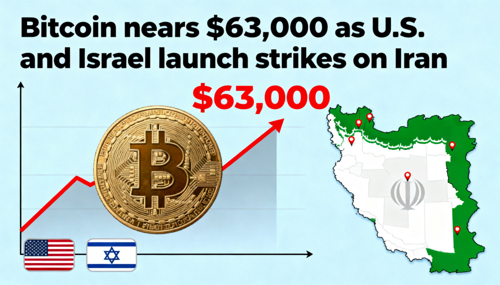 Earlier in the session, bitcoin dropped toward $63,000 after the U.S. and Israel launched military strikes on Iran, sending the token down roughly 3% within hours. The decline marked its lowest level since the Feb. 5 sell-off, when prices briefly dipped under $60,000.