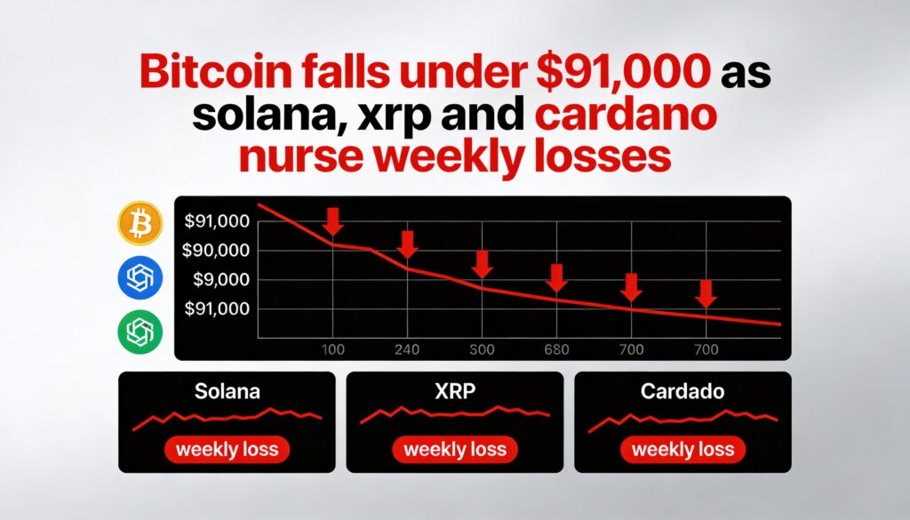 Bitcoin drops under $91,000, with Solana, XRP and Cardano nursing sharp weekly declines.