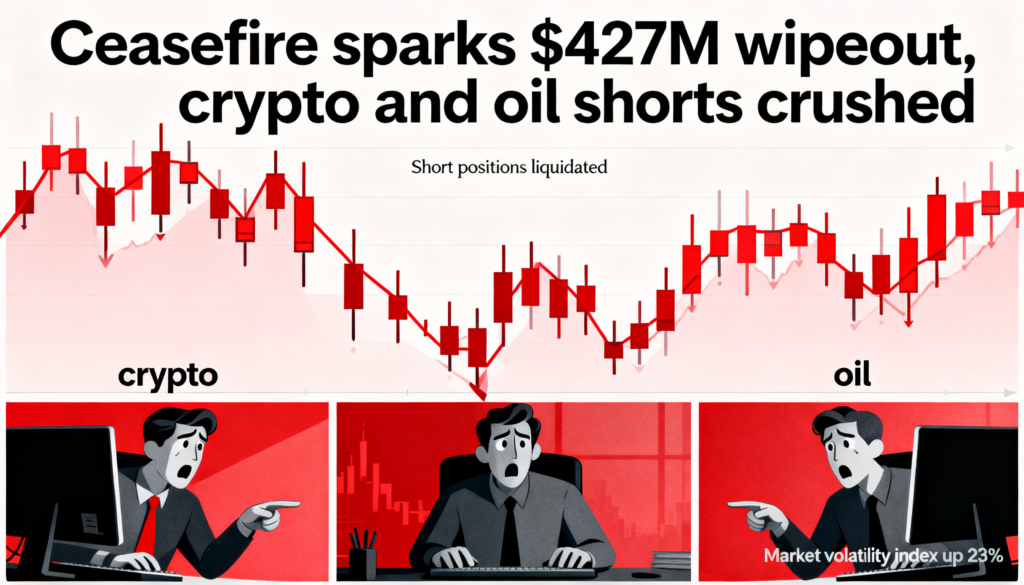 Short sellers positioned for a continued escalation in the Iran conflict were hit with $427 million in losses over the past 24 hours, as bitcoin surged above $72,000 following the ceasefire announcement.