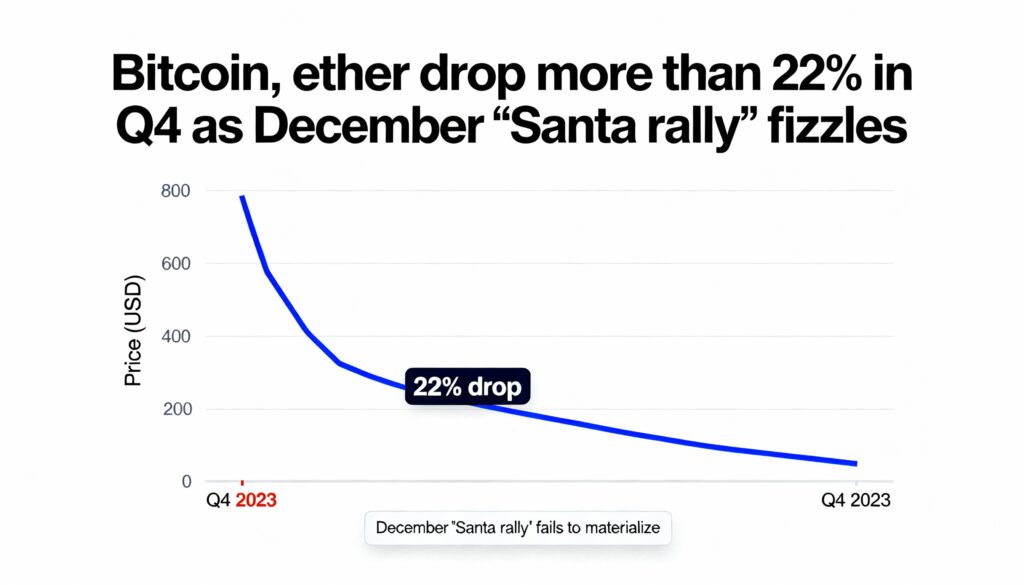 Bitcoin and ether wrapped up December without delivering the year-end surge traders often count on, closing out a quarter that highlighted how quickly crypto momentum can fade when liquidity dries up and risk appetite weakens. The much-discussed “Santa rally” never gained traction. Each attempt by bitcoin to reclaim important technical thresholds was met with selling, while ether and other large-cap tokens moved lower in tandem.