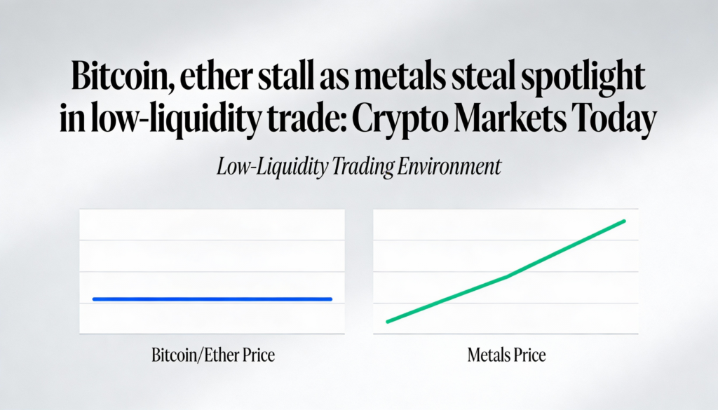 Bitcoin and ether were little changed amid thin liquidity on Tuesday as a rally in gold and silver underscored a broader risk-off rotation that is also benefiting select crypto tokens.