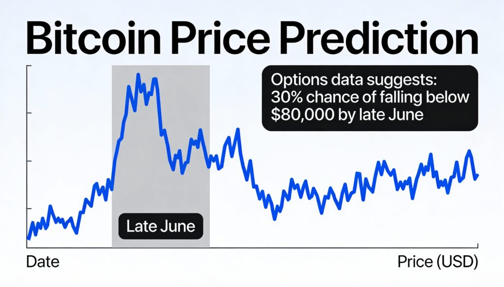 On Derive.xyz, a decentralized platform for on-chain options, perpetuals, and structured products, traders see a roughly 30% probability of bitcoin falling below $80,000 by the end of June. Similar positioning is visible on Deribit, the largest centralized options exchange.