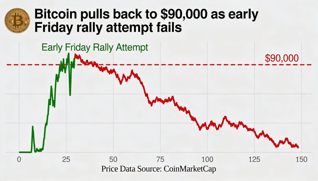 Bitcoin fell back toward the $90,000 level on Friday after a brief mid-session rally failed to hold, as investors digested mixed U.S. economic data, firmer inflation expectations and a delay in a closely watched Supreme Court decision.