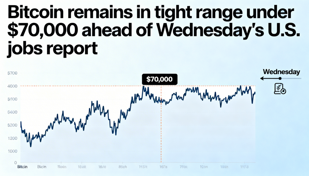 Bitcoin briefly dipped alongside equities before stabilizing, trading around $69,200 by mid-morning — little changed from the previous 24 hours. Ether lagged behind with a steeper pullback, while XRP and Solana also posted modest losses.