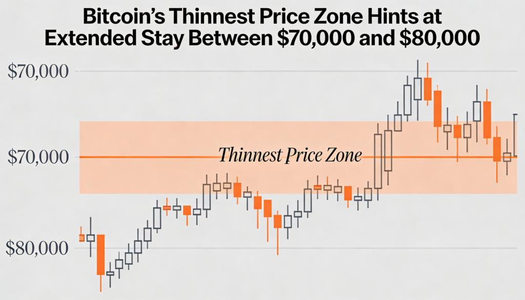 Bitcoin has logged roughly 35 days within this $10,000 bracket, making it one of the least developed price zones. Historically, the asset has tended to move quickly through this range rather than establishing sustained support or resistance.