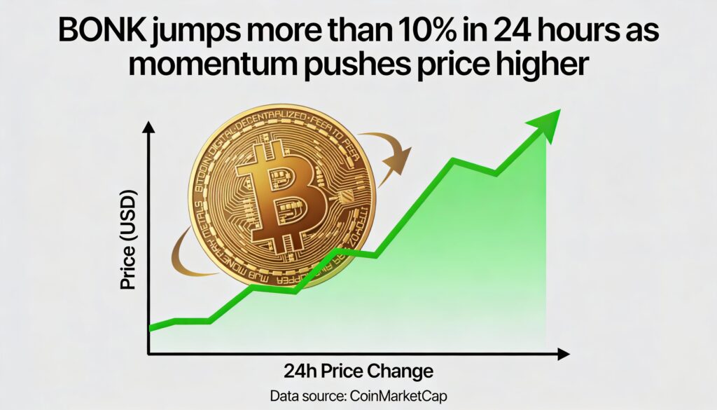 BONK rallied over the past 24 hours, climbing roughly 10.6% to around $0.00000833 after clearing an important technical barrier. The advance developed steadily, with price action trending higher throughout the session and printing a sequence of higher intraday lows before peaking near $0.00000844, according to CoinDesk Research’s technical analysis data.