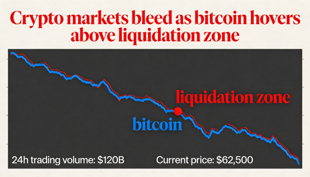 Bitcoin slipped toward $63,000 on Tuesday, extending its losing streak to four days as a firmer U.S. dollar and weaker equities weighed on risk assets globally. Traders warn that a decisive break below $60,000 could spark another wave of liquidations and potentially drag prices toward $52,500, a key support level dating back to 2021.