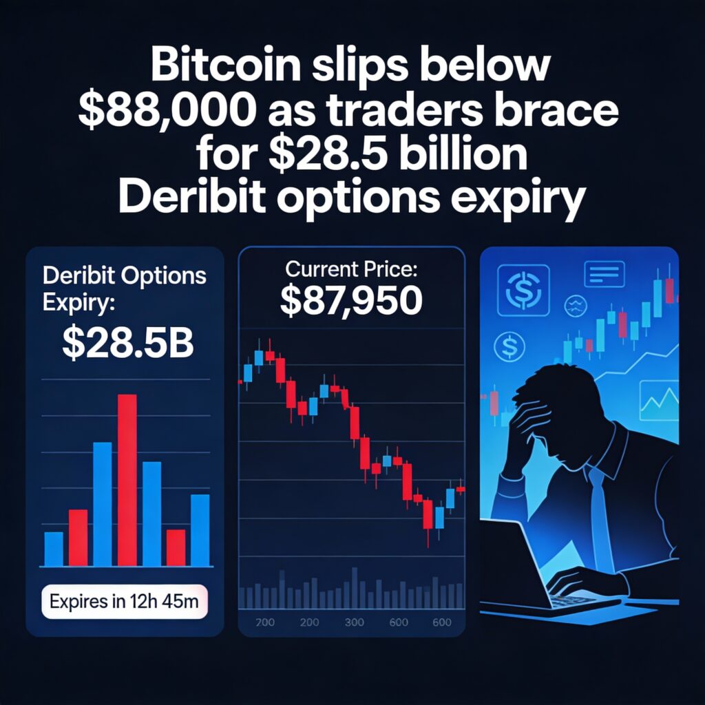BTC slides below $88,000 as traders eye $28.5 billion options expiry on Deribit
