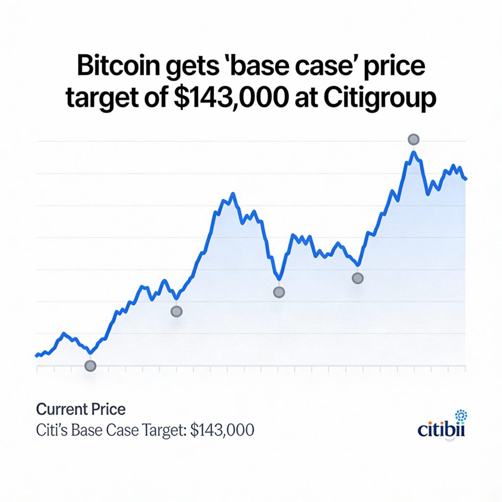 Citigroup has set a 12-month “base case” price target for bitcoin at $143,000, representing roughly 62% upside from current levels near $88,000, citing potential ETF inflows and continued strength in traditional equity markets.