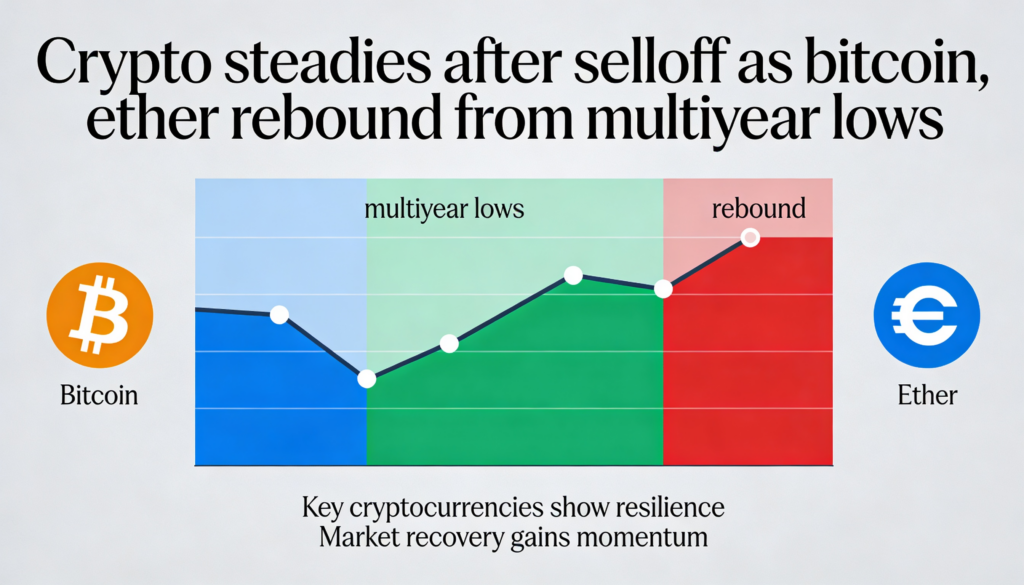 The crypto market steadied after Tuesday’s rout pushed bitcoin and ether to fresh multiyear lows. Bitcoin was last trading near $76,100 after rebounding from an intraday low of $72,870—its weakest level since November 2024. Ether climbed to around $2,255 after falling earlier to a level last seen in May. Both assets were marginally higher on the day as of midnight UTC.