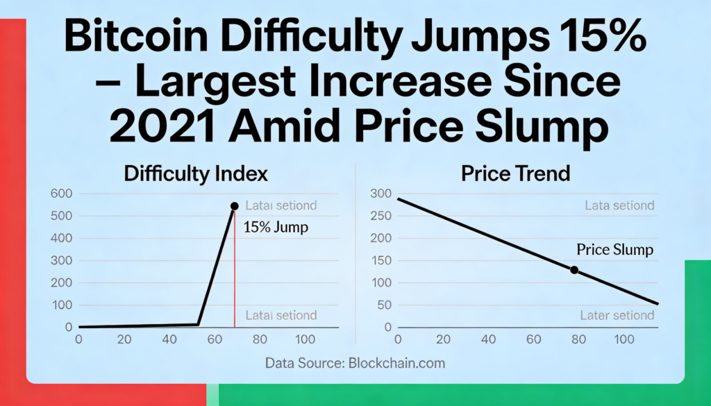 Mining difficulty, which determines how challenging it is to produce a new block, adjusts every 2,016 blocks — roughly once every two weeks — to maintain the network’s average 10-minute block time. The sharp increase follows a prior 12% decline that occurred after hashrate weakened.