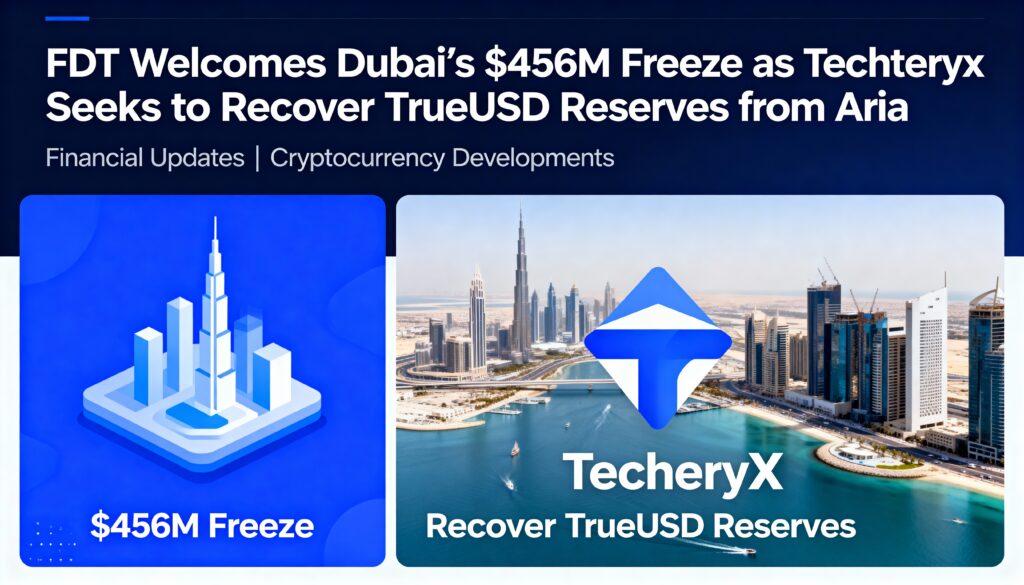 First Digital Trust (FDT) has voiced support for Techteryx’s efforts to recover $456 million in TrueUSD reserves frozen by a Dubai court. The funds became illiquid in 2023 after transfers into complex investment structures tied to the Aria Group, prompting an emergency bailout from Justin Sun to keep the stablecoin operational.