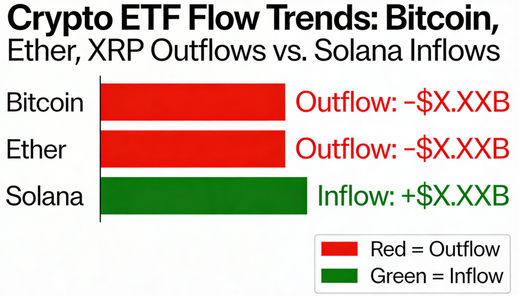 U.S. spot crypto ETFs experienced broad outflows, led by bitcoin and ether products, while Solana funds drew fresh capital — signaling rotation within the asset class rather than a full-scale retreat.