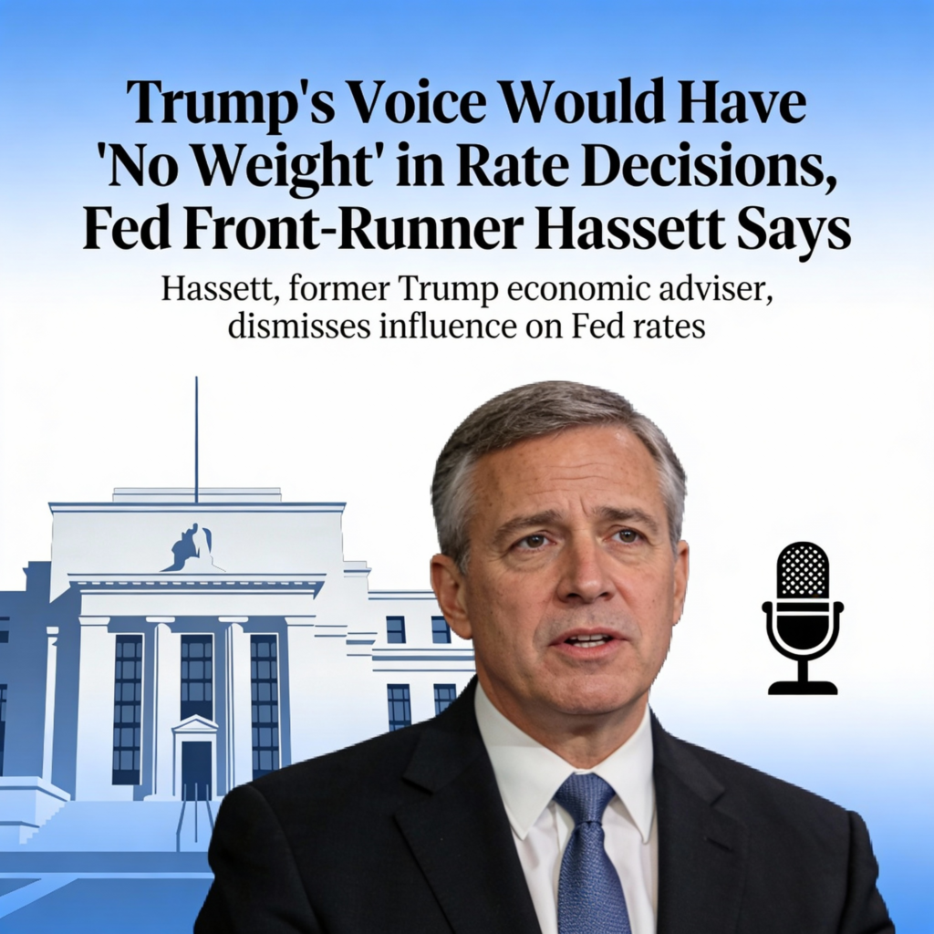 Kevin Hassett, a top contender for President Donald Trump’s Fed chair pick, stated Sunday that Trump would not influence interest rate decisions under his leadership.