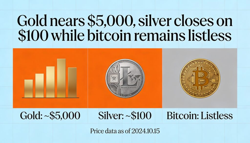 Gold nears $5,000, silver climbs toward $100, while bitcoin struggles to move
