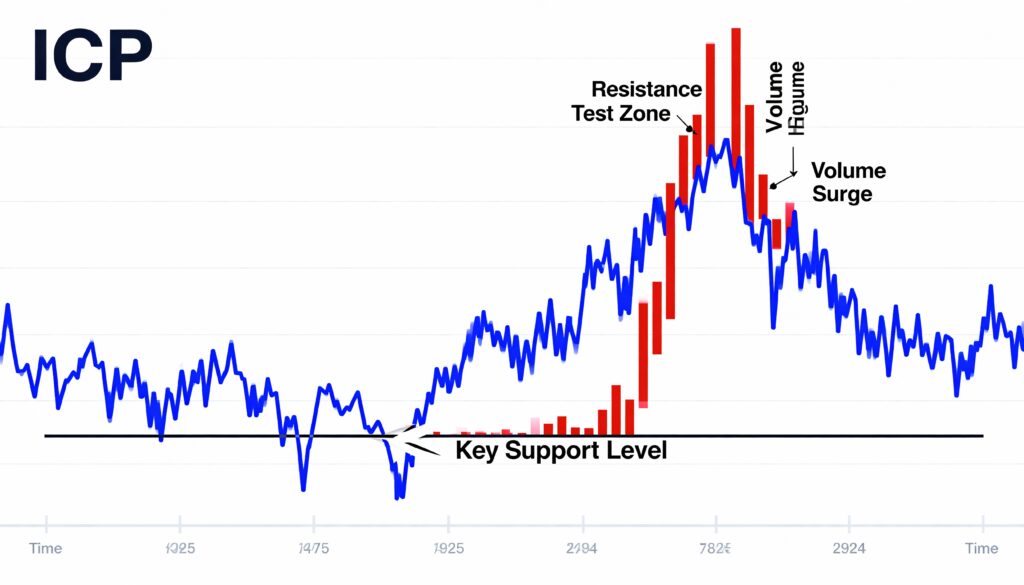 Heavy trading during an unsuccessful recovery attempt forced ICP into a narrower consolidation zone below $4.95, adding to near-term downside pressure.
