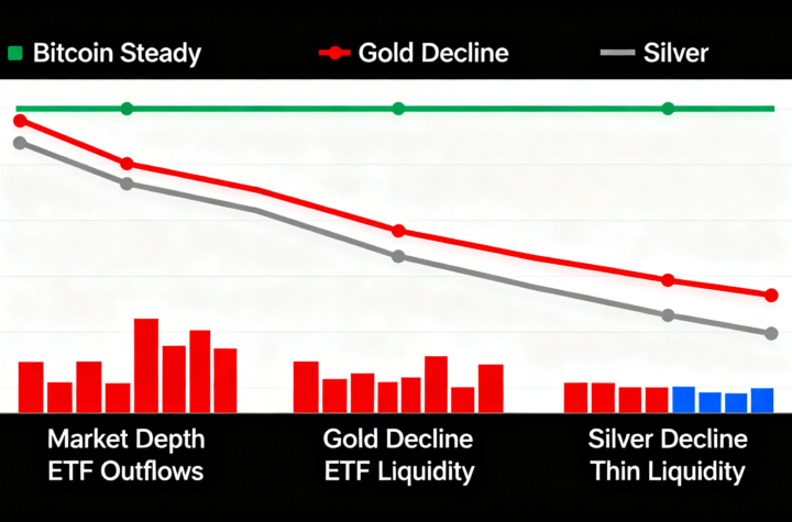 JPMorgan notes bitcoin’s stability while gold and silver weaken due to ETF-driven outflows and liquidity pressures.
