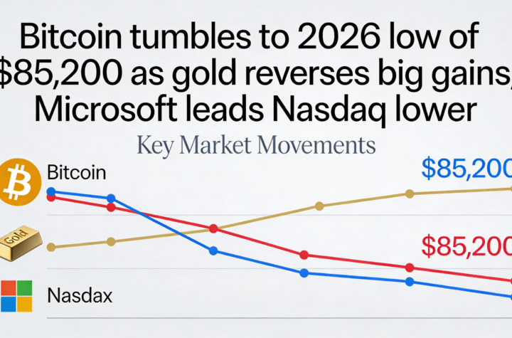 BTC drops to $85,200, marking 2026 lows, while gold gives back gains and Microsoft weighs on the Nasdaq