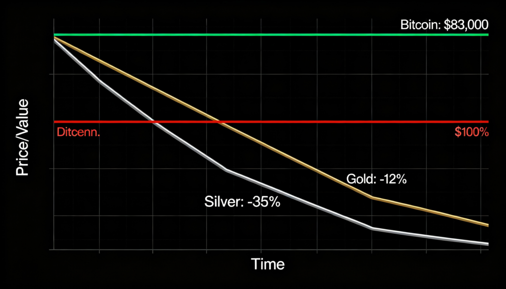 Silver plunges 35% and gold slides 12% amid a metals selloff, with bitcoin holding firm at $83,000.