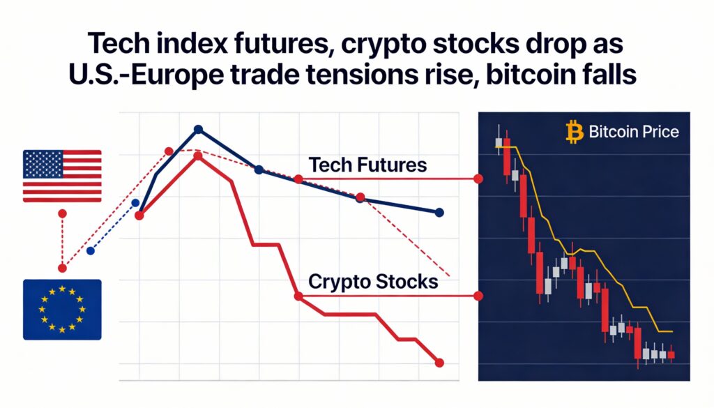 Tech and crypto equities fall amid heightened U.S.-Europe trade tensions, while bitcoin dips.