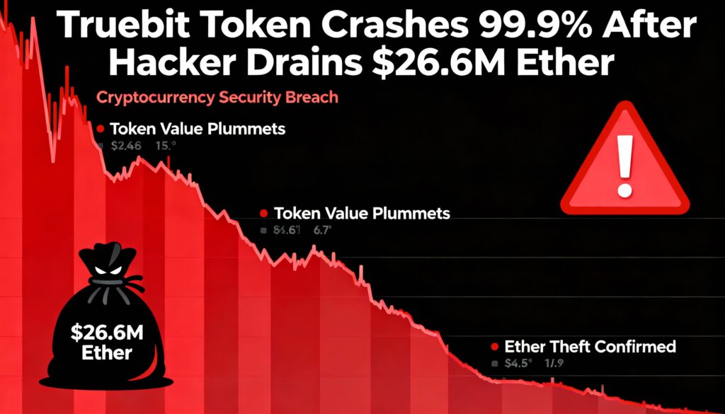 Truebit’s TRU token plunged nearly 100% on Thursday after an attacker drained roughly 8,535 ETH — about $26.6 million — from the protocol’s reserves, according to on-chain data and independent researchers.