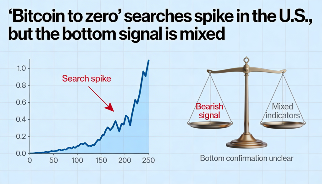 Such spikes in pessimistic search terms are often interpreted as signs of capitulation. In prior cycles, including 2021 and 2022, similar surges in “bitcoin zero” queries appeared near local price bottoms, reinforcing the idea that extreme retail fear can serve as a contrarian buy signal.
