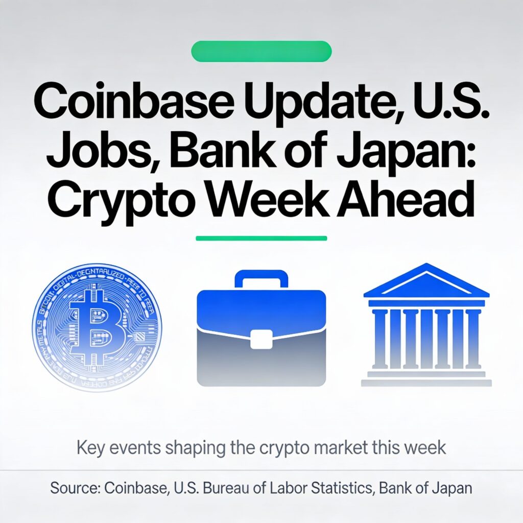 The coming week will be busy for both crypto markets and the wider economy, with major macro data releases, central bank decisions, and key crypto developments. Investors will focus on U.S. employment and inflation figures, alongside interest-rate moves in Japan, Europe, and the U.K. Meanwhile, Coinbase, the largest publicly traded crypto exchange, is set to roll out a platform update expected to include tokenized stocks and a prediction market.