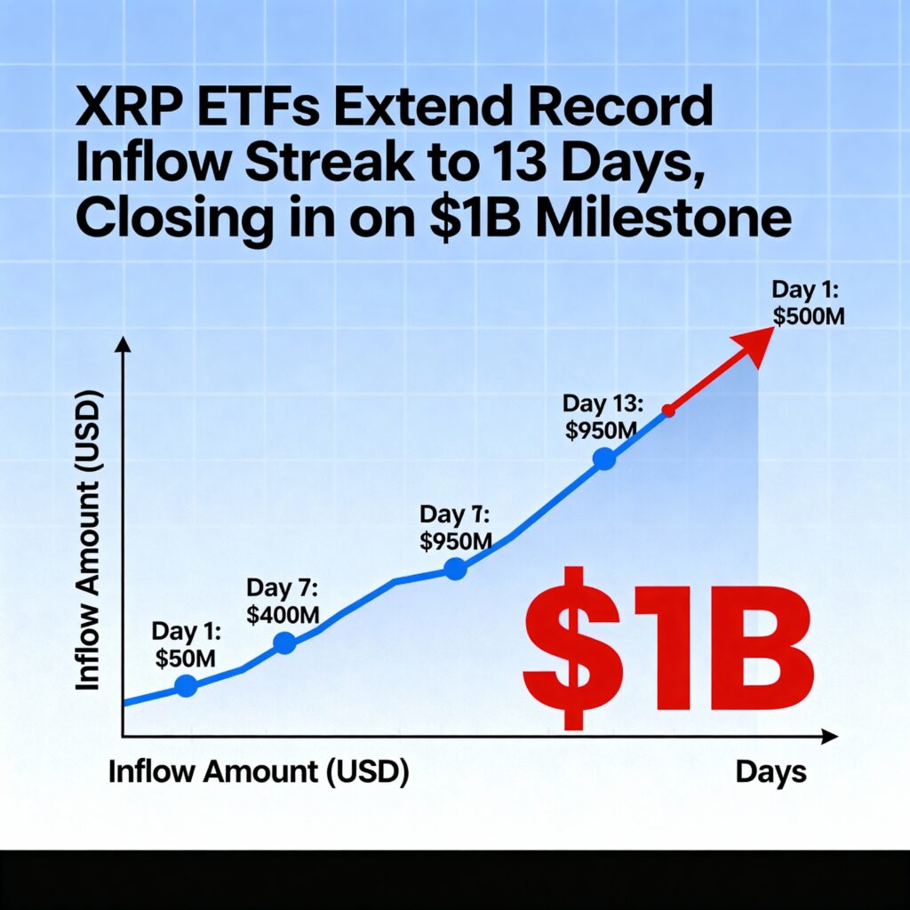This marks the 13th straight day of net inflows, making XRP ETFs one of the fastest-growing crypto-asset vehicles in traditional finance. With the $1 billion milestone within reach in less than a month, the trend reflects strong adoption and liquidity for XRP through regulated ETFs.