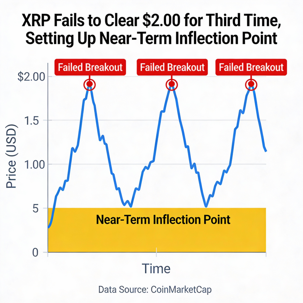 Price action is compressing between support at $1.97–$1.98 and supply at $2.00–$2.01, keeping XRP range-bound. Late-session rebounds briefly pierced $2.00 but lacked follow-through.